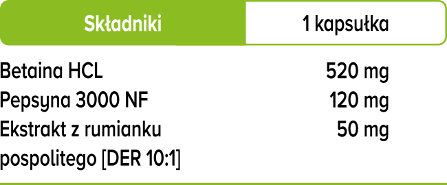 Składniki: Betaina HCL, pepsyna 3000 NF, ekstrakt z rumianku pospolitego [DER 10:1], otoczka kapsułki: hydroksypropylometyloceluloza.