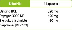 Składniki: Betaina HCL, pepsyna 3000 NF, ekstrakt z liści mięty pieprzowej* [DER 10:1], otoczka kapsułki: hydroksypropylometyloceluloza.