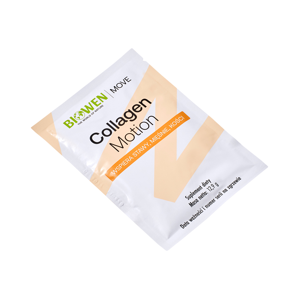Collagen Motion marki Biowen to innowacyjna formuła dla osób, które chcą aktywnie zadbać o swoje stawy, chrząstki i układ kostno-mięśniowy – od wewnątrz, naturalnie i skutecznie. W każdej saszetce znajduje się starannie skomponowana mieszanka składników aktywnych: kolagenu typu I, II i III, siarki organicznej MSM, glukozaminy, chondroityny oraz dobroczynnych ekstraktów roślinnych. To zaawansowany kolagen na stawy i ruchomość, który działa wielokierunkowo.