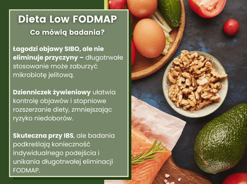 - Dieta low FODMAP może czasowo złagodzić objawy SIBO, ale nie eliminuje przyczyny choroby. Stosowanie jej powinno być krótkoterminowe, a następnie rozszerzane, aby nie zakłócić równowagi mikrobioty jelitowej. W leczeniu SIBO kluczowa jest odpowiednia diagnostyka i terapia eliminująca nadmiar bakterii [1].
