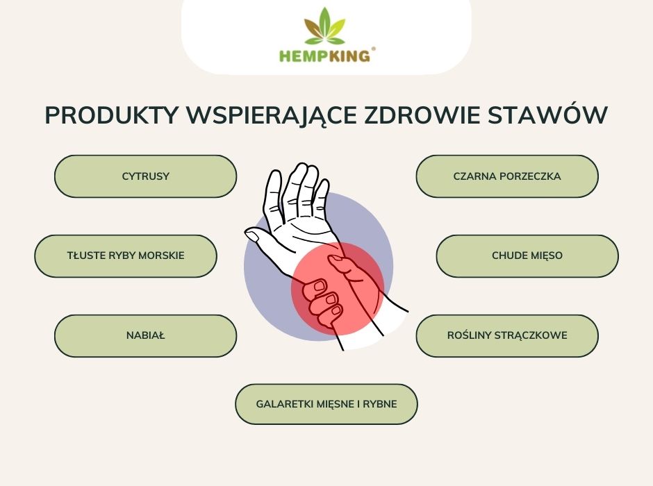 Nie można zapominać o witaminie D, która wspiera prawidłowe funkcjonowanie układu kostno-stawowego. Jej naturalne źródła to przede wszystkim ekspozycja na słońce oraz tłuste ryby. Dla osób dbających o zdrowie stawów ważne jest również spożywanie produktów bogatych w białko, które znajdziemy w chudym mięsie, nabiale oraz roślinach strączkowych. W nabiale znajdziemy także dużo wapnia, który wzmacnia kości. Warto także zwrócić uwagę na kolagen, który można dostarczyć organizmowi poprzez spożywanie galaretek mięsnych czy rybnych. Oto lista produktów wspierających zdrowie stawów: