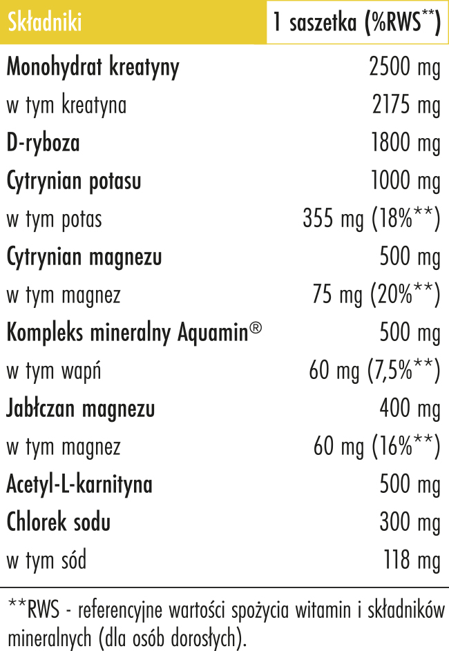 Monohydrat kreatyny (2500 mg, w tym 2175 mg kreatyny), D-ryboza (1800 mg), cytrynian potasu (1000 mg, w tym 355 mg potasu), cytrynian magnezu (400 mg, w tym 60 mg magnezu), jabłczan magnezu (400 mg, w tym 64 mg magnezu), Aquamin™ (500 mg, w tym 60 mg wapnia), acetylo L-karnityna (500 mg), chlorek sodu (300 mg, w tym 118 mg sodu), aromat cytrynowy.