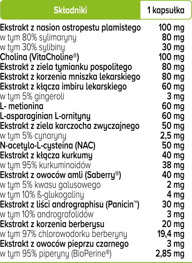 Składniki w jednej porcji (w jednej kapsułce): Ekstrakt z nasion ostropestu plamistego standaryzowany na 80% sylimaryny oraz 30% sylibiny [DER 45:1], cholina (VitaCholine®), ekstrakt z ziela tymianku pospolitego [DER 20:1], ekstrakt z korzenia mniszka lekarskiego [DER 20:1], ekstrakt z kłącza imbiru lekarskiego standaryzowany na 5% gingeroli [DER 30:1], L- metionina, L-asparaginian L-ornityny, ekstrakt z ziela karczocha zwyczajnego standaryzowany na 5% cynaryny [DER 30:1], N-acetylo-L-cysteina (NAC), ekstrakt z kłącza kurkumy (Curcumin C3 Complex®) standaryzowany na 95% kurkuminoidów [DER 45:1], ekstrakt z owoców amli standaryzowany na kwas galusowy 5% oraz 10% ß-glukogaliny (Saberry®) [DER 60:1], ekstrakt z liści andrographisu standaryzowany na 10% andrografolidów [DER 30:1] (Panicin™), ekstrakt z korzenia berberysu standaryzowanyna 97% chlorowodorku berberyny [DER 60:1], ekstrakt z owoców pieprzu czarnego standaryzowany na 95% piperyny (BioPerine®), otoczka kapsułki: hydroksypropylometyloceluloza.