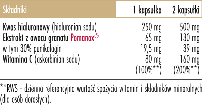kwas hialuronowy (hialuronian sodu), ekstrakt z owocu granatu Punica granatum Pomanox® (standaryzowany na 30% punikalagin), witamina C (askorbinian sodu), kapsułka roślinna (hydroksypropylometyloceluloza).