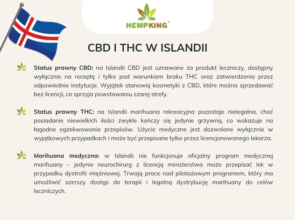 Na Islandii ramy prawne dla rynku CBD są dość rygorystyczne w porównaniu do innych krajów europejskich. Zaklasyfikowano kannabidiol jako produkt leczniczy. Oznacza to, że olej CBD przeznaczony do spożycia można kupić w aptekach wyłącznie na receptę wypisaną przez lekarza. Ponadto władze islandzkie zezwalają na sprzedaż wyłącznie produktów CBD, które uzyskały zgodę Europejskiej Agencji Leków lub Islandzkiej Agencji Leków.