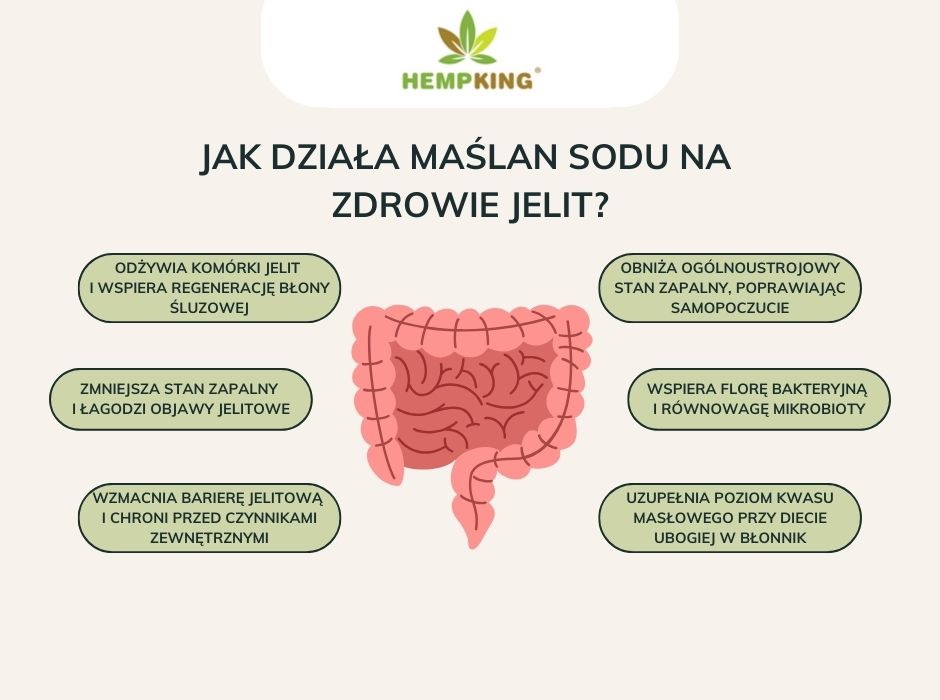Maślan sodu, jako pochodna kwasu masłowego, odgrywa zasadniczą rolę w utrzymaniu zdrowia i funkcji jelit. Jego działanie koncentruje się przede wszystkim na odżywianiu komórek błony śluzowej jelita, co jest kluczowe dla zachowania ich prawidłowej struktury i funkcji. Dzięki temu, maślan sodu wspiera integralność bariery jelitowej, chroniąc przed szkodliwymi czynnikami zewnętrznymi i zmniejszając ryzyko wystąpienia chorób czynnościowych i zapalnych jelit, takich jak zespół jelita drażliwego czy choroba Leśniowskiego-Crohna. Ponadto, jego działanie przeciwzapalne pomaga w łagodzeniu objawów związanych z zapaleniem. A to przekłada się na obniżenie ogólnoustrojowego stanu zapalnego i poprawę samopoczucia pacjentów.