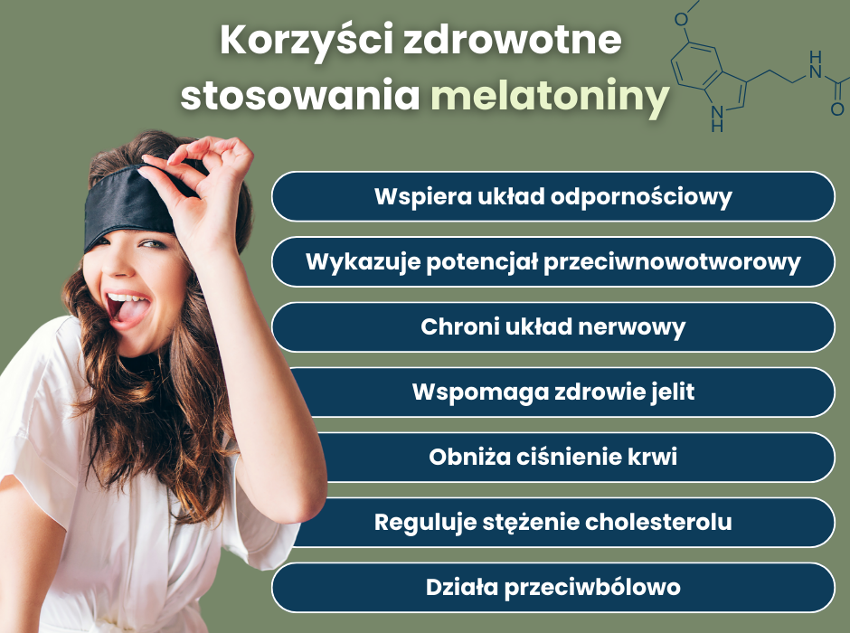 Te zmiany przygotowują organizm do regenerującego snu. Melatonina pomaga też uregulować fazy snu – szczególnie przyspiesza wejście w głęboki sen, najważniejszy dla wypoczynku.