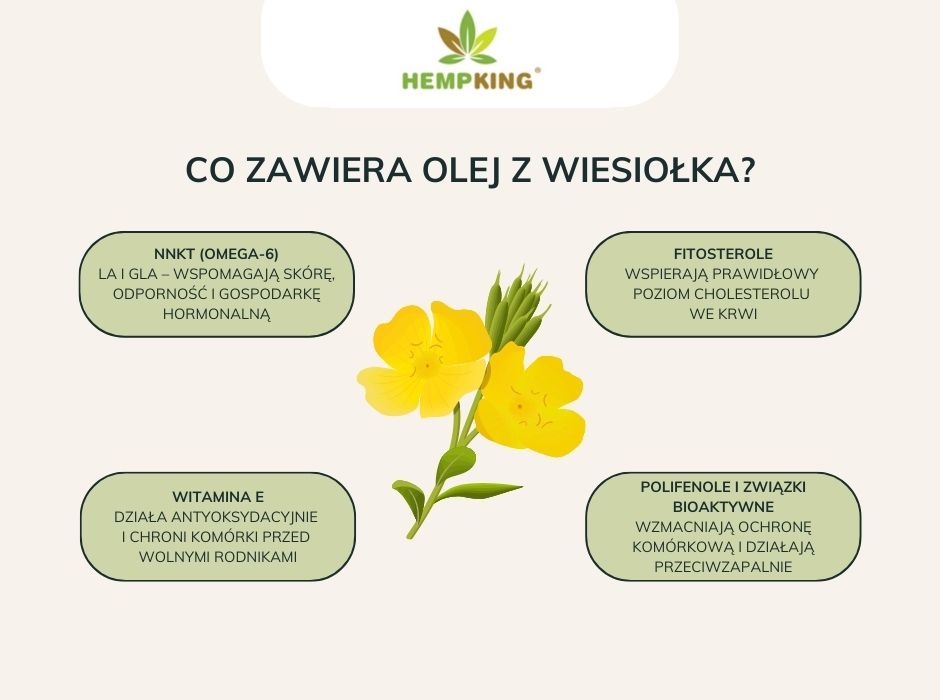 Najcenniejsze składniki oleju z wiesiołka to niezbędne nienasycone kwasy tłuszczowe, przede wszystkim kwas linolowy (LA) i gamma-linolenowy (GLA), zaliczane do grupy omega-6. Odgrywają one kluczową rolę w utrzymaniu zdrowej skóry, regulacji procesów zapalnych, a także we wspieraniu prawidłowego działania układu hormonalnego i odpornościowego. Oprócz NNKT, olej z wiesiołka zawiera również witaminy i minerały. Jest bogaty w witaminę E, znaną ze swoich silnych właściwości antyoksydacyjnych, fitosterole, które wspomagają utrzymanie prawidłowego poziomu cholesterolu oraz polifenole i inne związki bioaktywne, wykazujące działanie ochronne na komórki organizmu.
