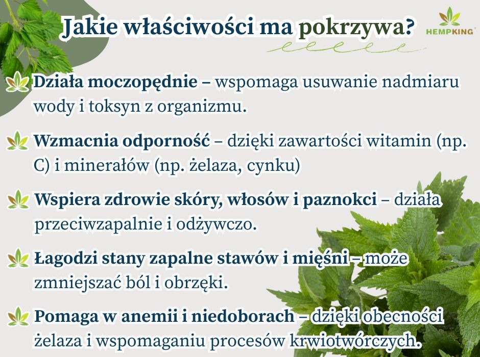 Pokrzywa dostarcza także kwasów organicznych, garbników oraz związków mineralnych o działaniu przeciwzapalnym i wspomagającym trawienie.