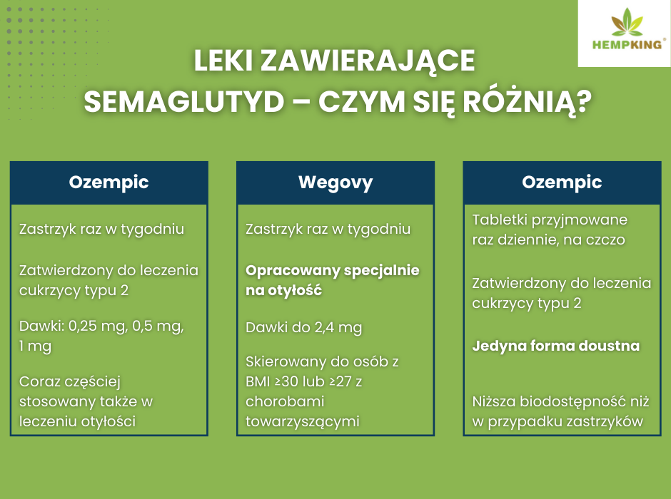 Na rynku dostępnych jest kilka leków, które zawierają semaglutyd. Choć substancja czynna jest ta sama, różnią się formą podania, przeznaczeniem i dawkowaniem.
