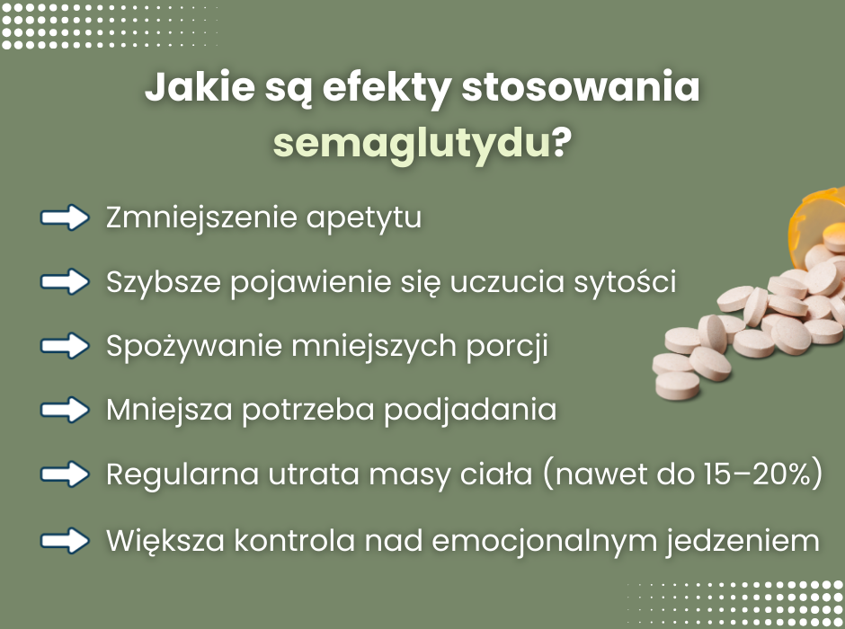Semaglutyd aktywuje receptory GLP-1 zlokalizowane w mózgu. W efekcie wysyłany jest sygnał o sytości, nawet jeśli zjadana porcja jest mniejsza niż zwykle. Co więcej – spowalnia opróżnianie żołądka, dzięki czemu uczucie sytości trwa dłużej. Semaglutyd wpływa też na preferencje żywieniowe. Wielu osób już po kilku tygodniach stosowania traci ochotę na przetworzoną żywność i słodycze. Zmniejsza się impuls do podjadania, a organizm zaczyna inaczej reagować na sygnały głodu.