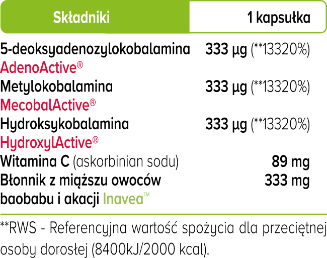 B12 (MecobalActive®️ Metylokobalamina 333 ug, HydroksyActive®️ Hydroksykobalamina 333 ug, AdenoActive®️ 1.5-deoksyadenozylokobalamina 333 ug) Inavea®️ błonnik z baobabu i akacji 333 mg, Witamina C 100 mg (askorbinian sodu), otoczka kapsułki: hydroksypropylometyloceluloza.